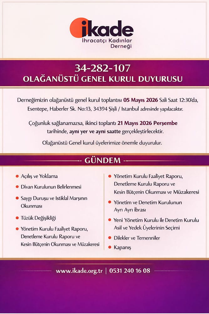 Derneğimizin Olağanüstü Genel Kurul toplantısı 05/ 05 /2026 Salı tarihinde saat 12:30’da Esentepe, Haberler Sk. No:13, 34394 Şişli/İstanbul adresinde aşağıdaki gündeme göre gerçekleşecek olup, çoğunluk sağlanamadığı takdirde ise ikinci toplantı 21 /05/ 2026 Perşembe tarihinde aynı gündemle, aynı yer ve saatte yapılmasına karar verilmiştir. Genel kurul üyelerimize önemle duyurulur.